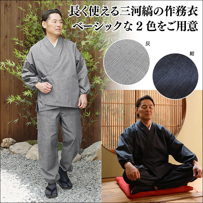 三河木綿の丈夫な作務衣(尻当て 膝当て付)(紺・灰)(M-LL)